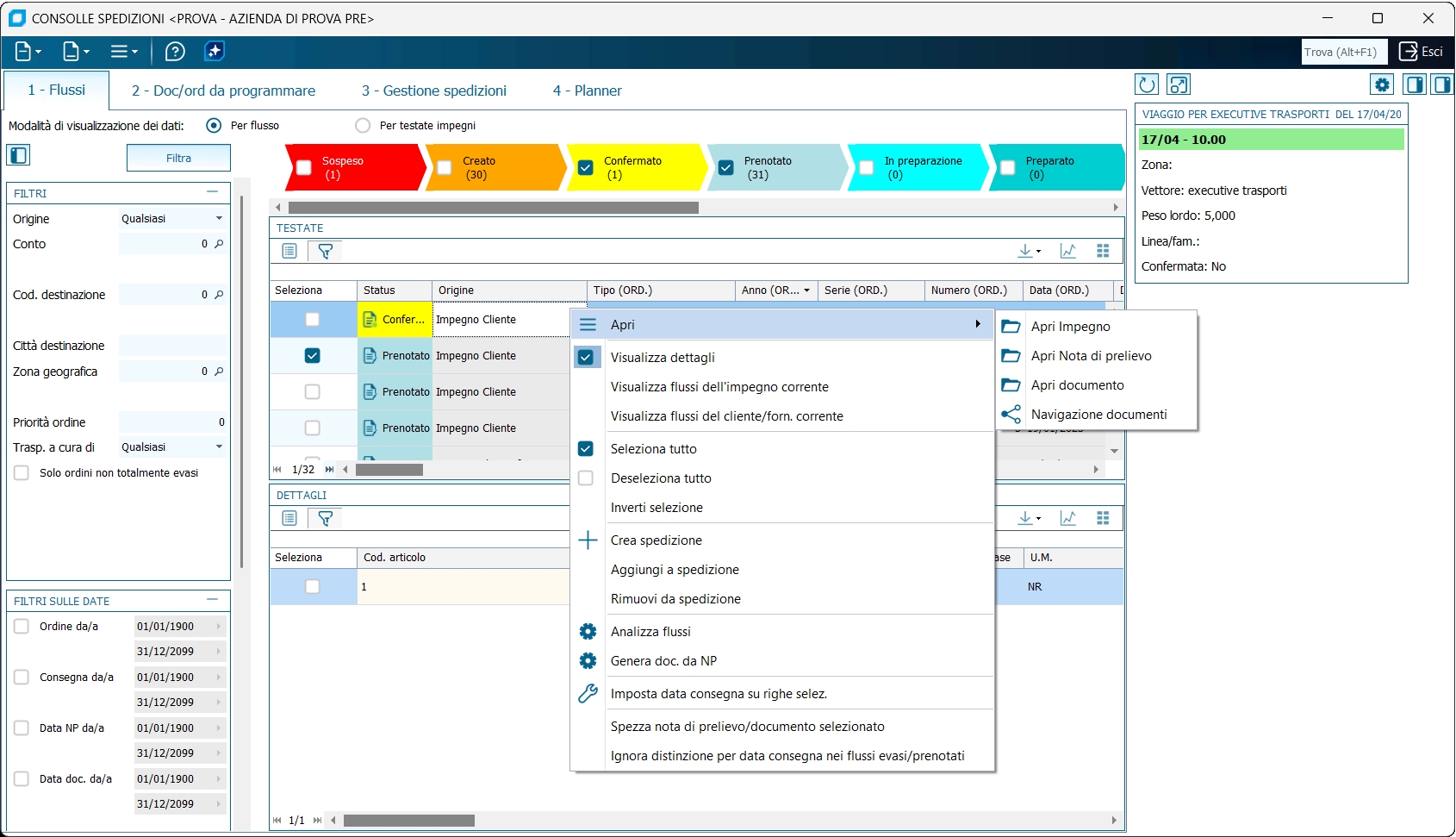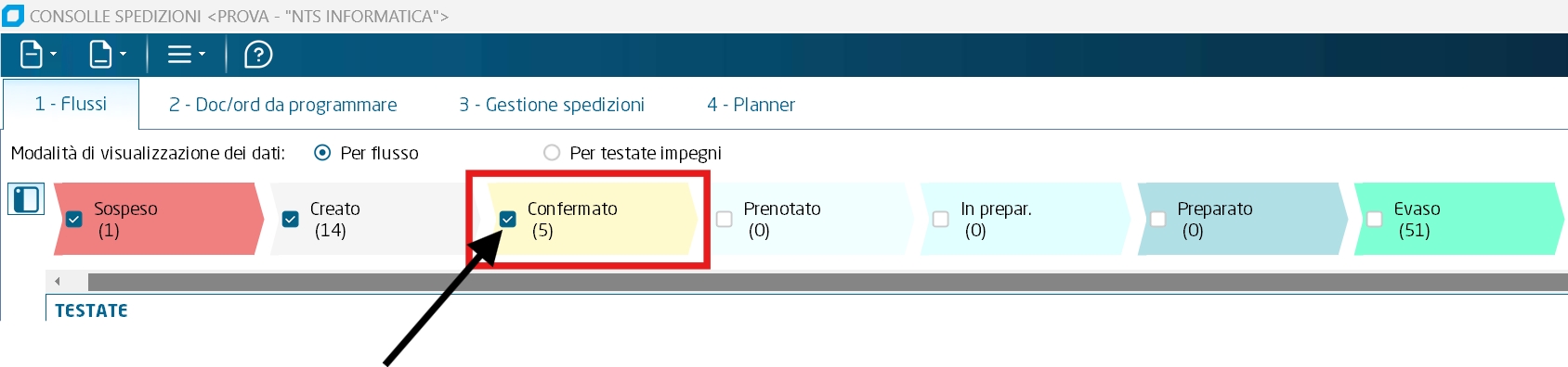 Moduli richiesti: Commerciale Avanzato (no Business Go) Questo programma è il pannello principale per la gestione delle spedizioni e contiene anche il programma "Planner": la "Consolle spedizioni" è il programma che accentra le funzioni utili a personale di backoffice e della logistica. In "Modalità di visualizzazione dei dati" = "Per flusso" la barra degli "status" di avanzamento mostra sempre tutti i 12 status: una volta avviata la ricerca tra parentesi vengono indicati anche quanti flussi sono in ciascuno status; l'utente può cliccare uno o più flussi spuntando il singolo check-box oppure, se vuole vedere solo ed esclusivamente i flussi in quello status, può cliccare con il tasto destro del mouse sulla freccia colorata corrispondente allo status.