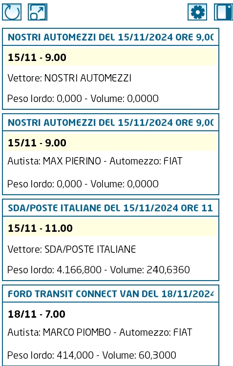 ad un 'Flusso' appartengono un insieme di righe dello stesso Impegno Cliente, con la stessa data consegna e che appartengono allo stesso viaggio, gli status seguono il flusso documentale di Business Experience, sono personalizzabili nel nome, nel colore e nell'icona, dal programma 'Status di avanzamento'. Nei tab "1 - Flussi" e "2 - Doc/ord da programmare" è presente una seconda wing a destra che mostra le prossime 20 spedizioni: nel titolo di ogni spedizione viene riportata la descrizione della spedizione stessa, mentre il contenuto del tile è personalizzabile dal pulsante "Imposta" (icona dell'ingranaggio) ed è in grado di contenere da 1 a 9 righe con informazioni personalizzate (la prima riga contiene sempre la data/ora prevista di ritiro, colorata in verde se in data odierna o di giallo se da ritirare nei prossimi 3 giorni).
