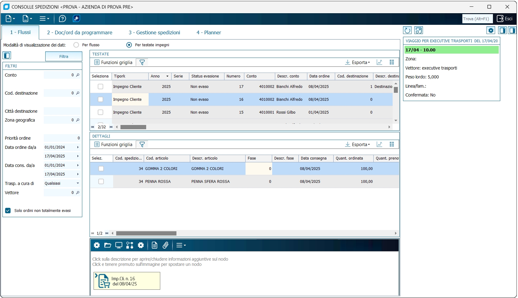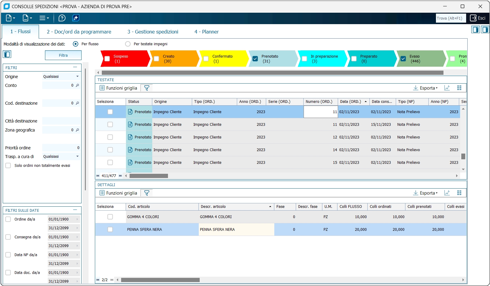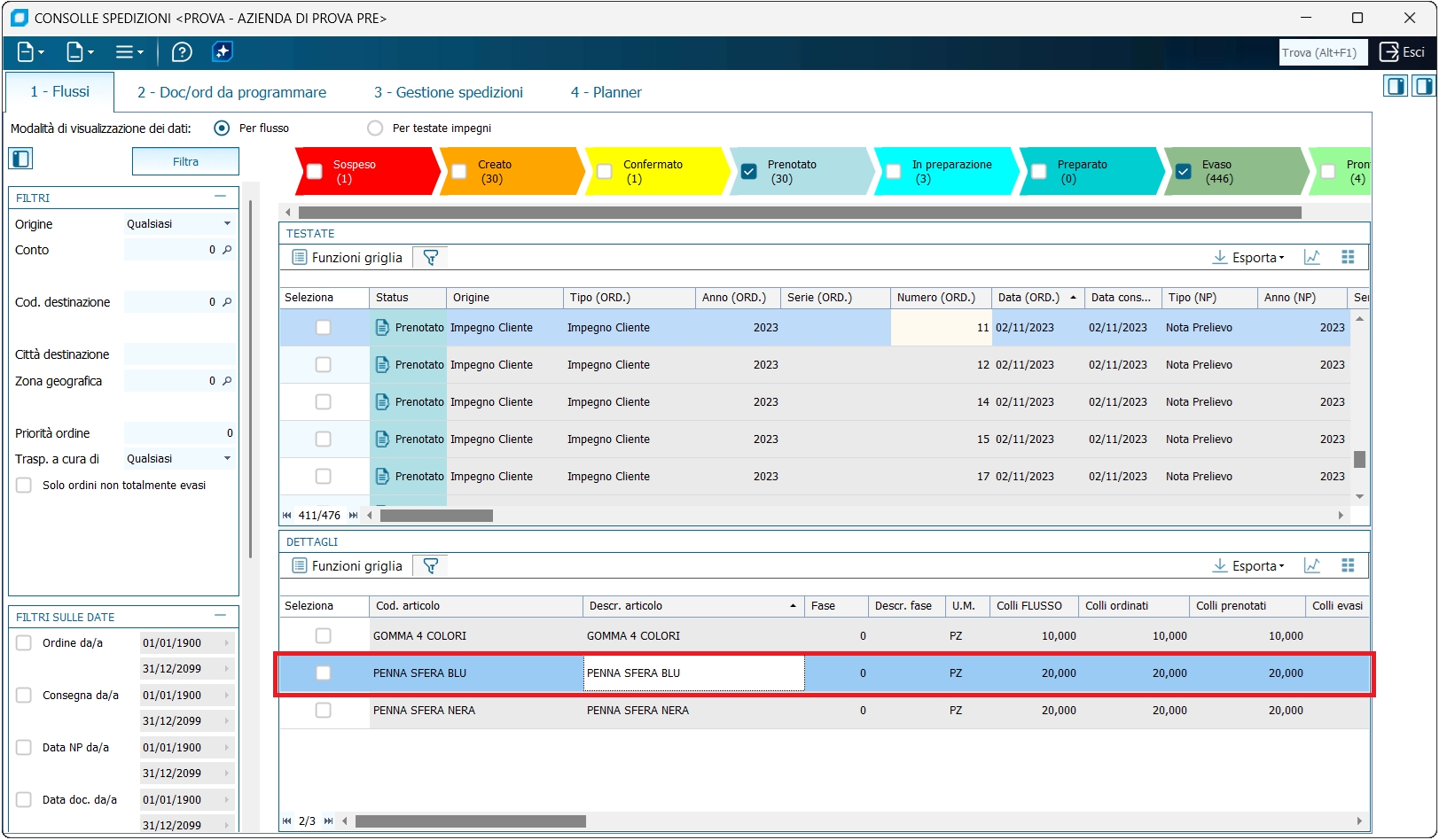 Menù strumenti di griglia Testate Apri permette di aprire l'impegno, Nota di prelievo, documeto o la navigazione documenti relativo al focus di riga. Visualizza Dettagli mostra o nasconde la griglia dei dettagli. Visualizza flussi dell'impegno corrente applica l'impegno corrente come filtro per la visualizzazione dei flussi. Visualizza flussi dell'cliente/fornitore corrente applica il cliente fornitore corrente come filtro per la visualizzazione dei flussi. Seleziona tutto permette di selezionare tutte le righe mostrate in tabella. Deseleziona tutto permette di deselezionare tutte le righe mostrate in tabella. Inverti selezione permette di invertire la selezione della righe in tabella. Crea Spedizione permette di creare una nuova spedizione. Aggiungi a Spedizione permette di aggiungere le righe selezionate ad una spedizione. Rimuovi da Spedizione permettere di togliere le righe selezionate dalla spedizione abbinata. Analizza Flussi permette di generare le note di prelievo degli impegni selezionati (solo flussi in status 'Creato' o 'Confermato'), scarta righe collegate ad impegni con codice pagamento = 0 Genera documenti da note di prelievo permette di generare documenti dalle note di prelievo degli impegni selezionati (solo flussi in status 'Preparato' o 'Prenotato') Imposta data di consegna su tutte le righe selez. permette di impostare una data di consegna su tutte le righe selezionate (solo flussi in status 'Sospeso', 'Preparato' o 'Prenotato') Spezza nota di prelievo/documento selezionato permette di spostare righe (o perte di esse) in altro documento, identico al documento di origine, la funzione non può essere usata su documenti collegati ad una dichiarazione in intento, su documenti collegati ad una finestra elettronica già trasmessa all'Agenzia delle Entrate e su documenti che evadono acconti. Ignora distinzione per data consegna nei flussi evasi prenotati se spuntato nella visualizzazione dei flussi originati da un impegno cliente, non distingue per data consegna della riga d'ordine se il flusso risulta già evaso. Serve per vedere in unico flusso nel caso in cui le righe di impegno con data consegna differente vengano evase nello stesso documento, mentre senza la spunta verrebbero comunque visualizzati due flussi distinti (la data di consegna di riga è un elemento di rottura dei flussi). Esempio di un impegno con 3 articoli evasi in date differenti, senza l'opzione attiva sono visualizzate solo le due righe con data consegna 02/11/2023, con l'opzione attive sono visualizzate tutte le righe a prescondere della data di consegna di riga.
