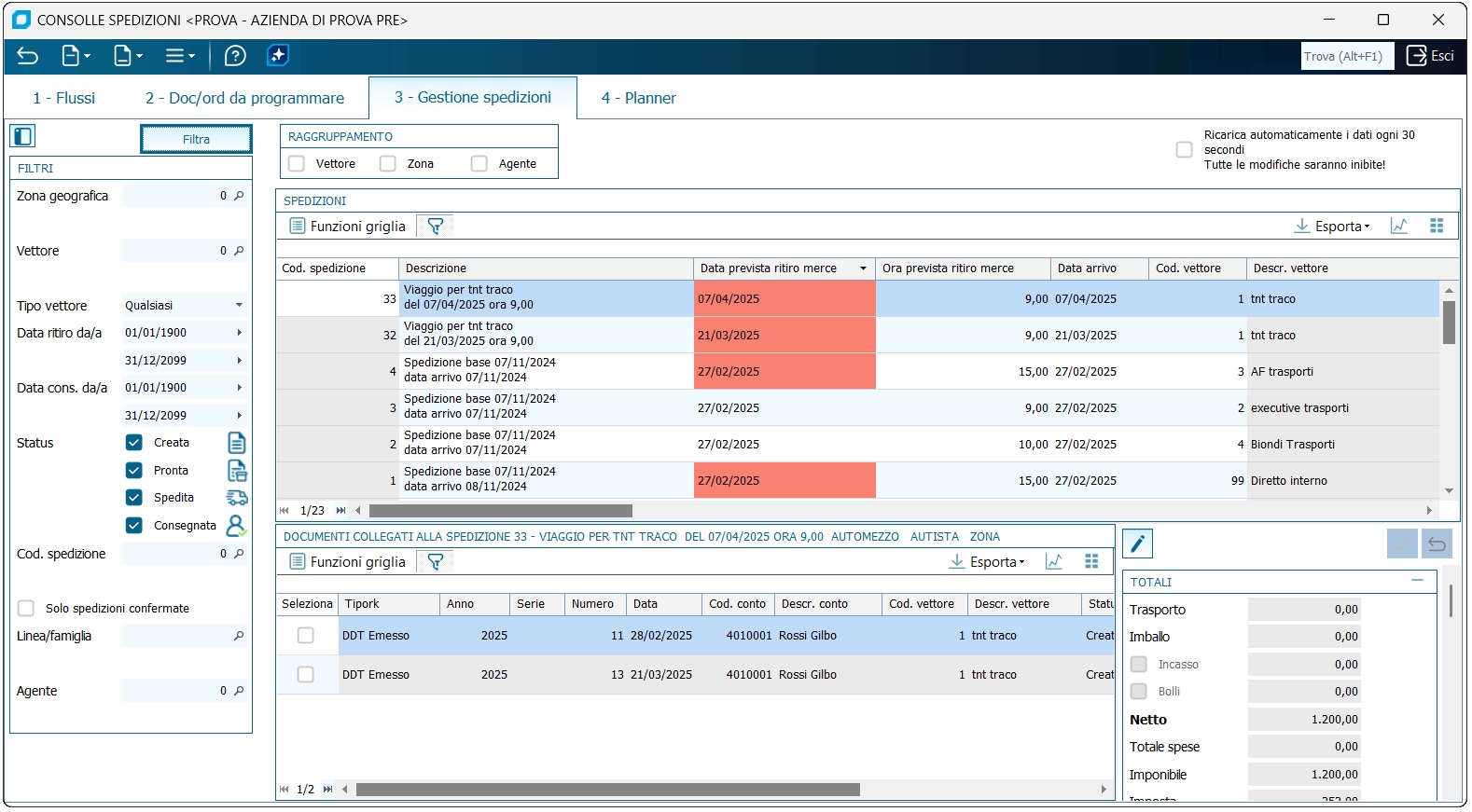 Il terzo tab è dedicato alla gestione delle spedizioni, il pannello è diviso in due sezioni Orizzontali e una Verticale a sinistra dedicata all'impostazione dei filtri , nella parte superiore del pannel è presente la griglia relativa alle testate delle spedizioni, mentre nella parte inferiore troviamo la griglia con le informazioni relative alla spedizione selezionata,alla sua sinistra è presente una versione semplificata dei dati di testata del piede del documento.