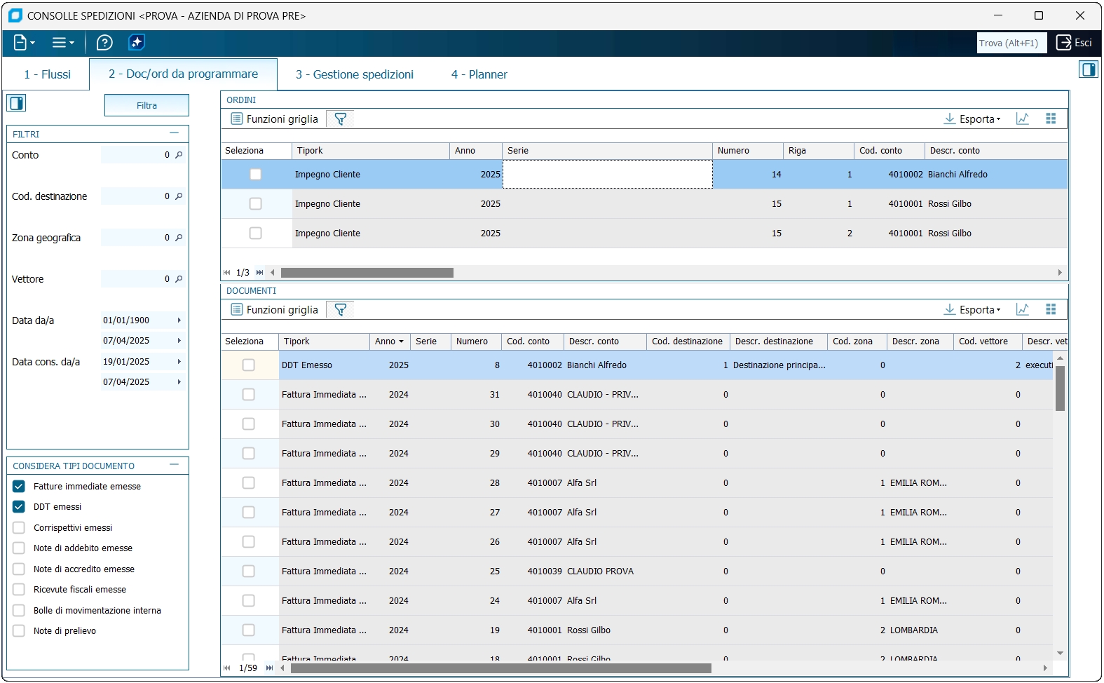 Il secondo tab è dedicato alla gestione dei documenti , il pannello è diviso in due sezioni Orizzontali e una Verticale a sinistra dedicata all'impostazione dei filtri , nella parte superiore del pannel è presente la griglia relativa alle testate degli ordini da programmare mentre nella parte inferiore troviamo la griglia con le testate relative ai documenti.
