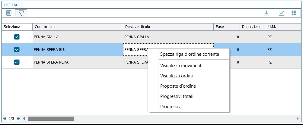 Impostando un filtro sulle date ordine pari al 01/01, in griglia vengono correttamente caricati tutti e tre i flussi, ma poi saranno mostrati quello evaso e/o confermato e/o creato in base ai flag selezionati --> il comportamento quindi sarà lo stesso se si imposta il nuovo flag "Solo ordini non totalmente evasi", che appunto va ad agire sull'origine del flusso, e non sullo status del singolo flusso. Menù strumenti griglia Dettagli