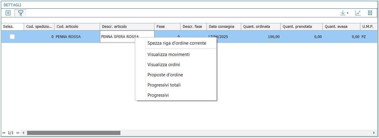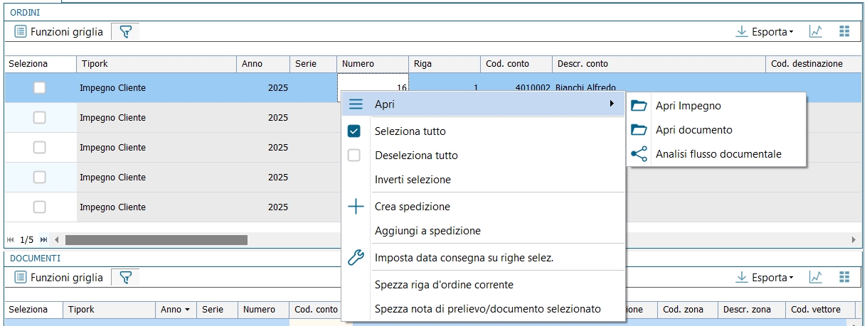 Apri permette di aprire l'impegno, Nota di prelievo, documento o di analizzare il flusso documentale relativo al focus di riga. Seleziona tutto permette di selezionare tutte le righe mostrate in tabella. Deseleziona tutto permette di deselezionare tutte le righe mostrate in tabella. Inverti selezione permette di invertire la selezione delle righe in tabella. Crea Spedizione permette di creare una nuova spedizione. Aggiungi a Spedizione permette di aggiungere le righe selezionate ad una spedizione. Imposta data di consegna su tutte le righe selez. permette di impostare una data di consegna su tutte le righe selezionate (solo flussi in status 'Sospeso', 'Preparato' o 'Prenotato'). Spezza riga d'ordine corrente permette di spezzare la q.ta residua da evadere creando una nuova riga.