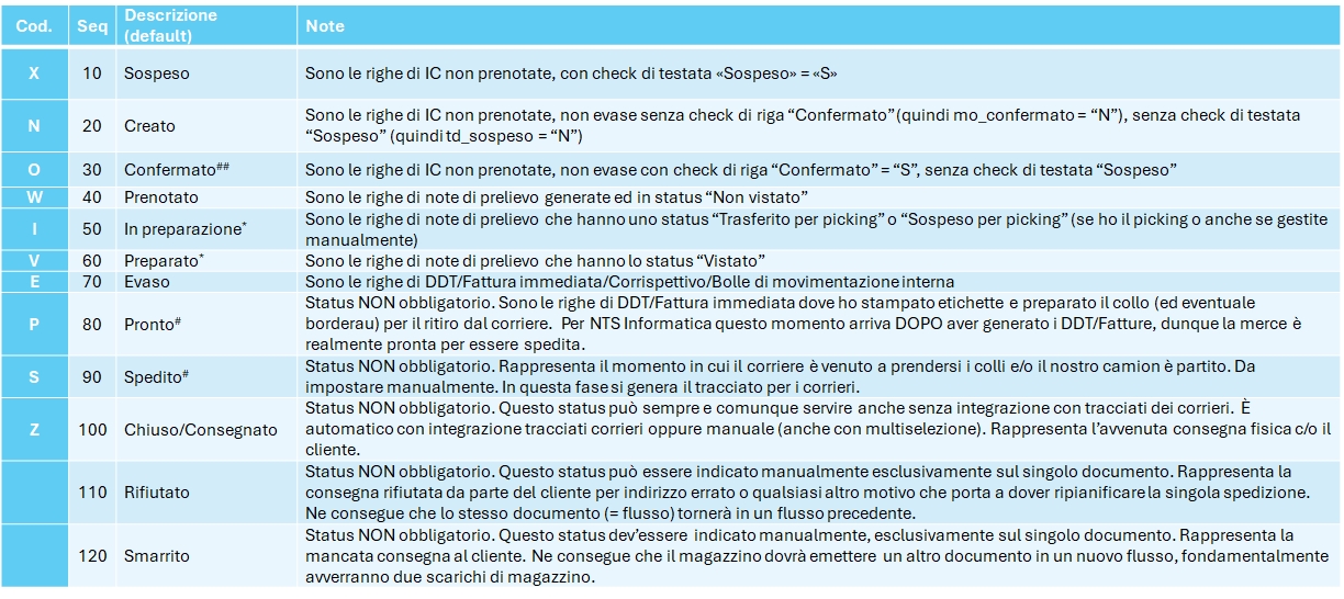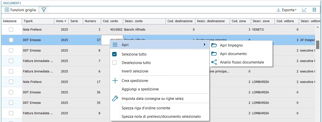 Apri permette di aprire l'impegno, Nota di prelievo, documento o di analizzare il flusso documentale relativo al focus di riga. Seleziona tutto permette di selezionare tutte le righe mostrate in tabella. Deseleziona tutto permette di deselezionare tutte le righe mostrate in tabella. Inverti selezione permette di invertire la selezione della righe in tabella. Crea Spedizione permette di creare una nuova spedizione. Aggiungi a Spedizione permette di aggiungere le righe selezionate ad una spedizione. Imposta data di consegna su tutte le righe selez. permette di impostare una data di consegna su tutte le righe selezionate (solo flussi in status 'Sospeso', 'Preparato' o 'Prenotato'). Spezza riga d'ordine corrente permette di spezzare la q.ta residua da evadere creando una nuova riga.
