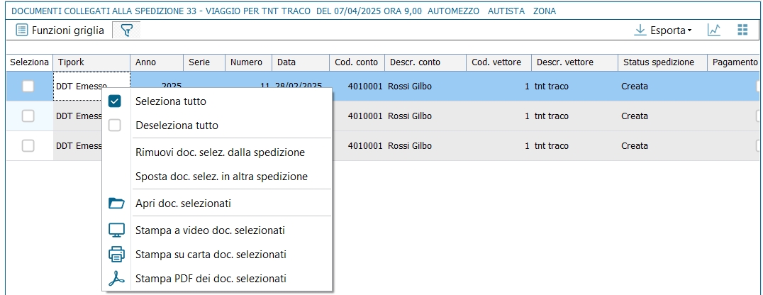 Seleziona tutto permette di selezionare tutte le righe mostrate in tabella. Deseleziona tutto permette di deselezionare tutte le righe mostrate in tabella. Rimuovi documento selezionato dalla spedizione permette di rimuovere dalla spedizione i documenti selezionati. Sposta documento selezionato in altra spedizione permette di spostare i documenti selezionati in un' altra spedizione. Apri documenti selezionati permette di aprire i documenti selezionati. Stampa a video documenti selezionati avvia la stampa dei documenti a video. Stampa su carta documenti selezionati avvia la stampa dei documenti direttamente alla stampante. Stampa PDF dei documenti selezionati avvia la stampa dei documenti alla gestione Invio Pdf. Per maggiori informazioni sul tab "Planner" vedi la pagina Planner |