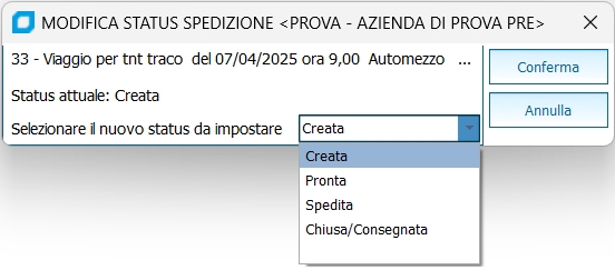 Nuova spedizione permette di creare una nuova spedizione. Cancella spedizione permette di cancellare la spedizione. Aggiungi documenti alla spedizione permette tramite form di selezionare dei documenti da aggiungere alla spedizione. Modifica status su spedizione corrente permette di modificare lo stato della spedizione, per impostare gli status 'da rispedire', 'rifiutata', 'smarrita' occorre operare manualmente sul documento dalla 'Gestione Documenti Magazzino' abilitando l'opzione di registro 'Spediz_ControllaSpedChiusa'.