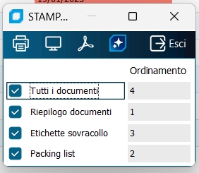 Menù stampe spedizioni permette di lanciare tutte le stampe relative alla spedizione in modo massivo ed assegnando un ordinamento di stampa , il numero progressivo di ordinamento viene viene popolato in automatico in base all'ordine con cui si spunta ogni tipologia di stampa, utilizzando l'opzione di registro "Spedizioni_AggiornaStatusQuandoStampa" lanciando la stampa Riepilogo documenti (sia dalla Consolle spedizioni che dal Planner) è possibile portare lo status della spedizione automaticamente su "Pronta" o "Spedita"