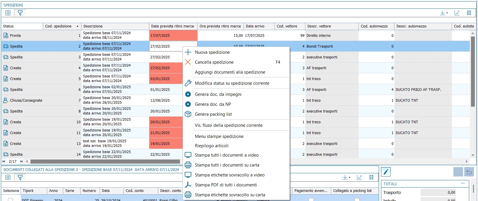 Stampa tutti i documenti su carta avvia la stampa di tutti i documenti della spedizione direttamentamente alla stampante. Stampa PDF di tutti i documenti avvia la stampa di tutti i documenti della spedizione alla gestione Invio Pdf. Stampa etichette sovracollo a video avvia la stampa etichette della spedizione a video, limitatamente comunque a fatture immediate emesse, ddt emessi e corrispettivi (non si stampano le etichette di impegni cliente/note di prelievo o di altri tipi documento che possono essere compresi in una spedizione, quali note di credito o di debito). Stampa etichette sovracollo su carta avvia la stampa etichette della spedizione direttamentamente alla stampante, limitatamente comunque a fattura immediate emesse, ddt emessi e corrispettivi (non si stampano le etichette di impegni cliente/note di prelievo o di altri tipi documento che possono essere compresi in una spedizione, quali note di credito o di debito). Menu strumenti griglia Documenti collegati alla spedizione