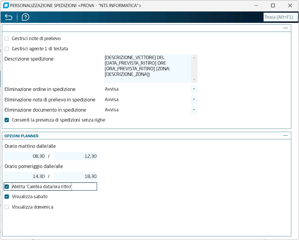 Abilita "Cambio data/ora ritiro" Se spuntato permette di utilizzare nel planner la funzione di cambio della data o dell'ora di ritiro su spedizioni già collegate a documenti di magazzino già emessi.
