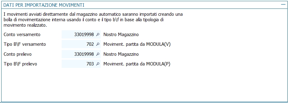 Importa i movimenti eseguiti sul magazzino automatico senza che siano stati richiesti da Business. Utilizza le informazioni indicate in configurazione: