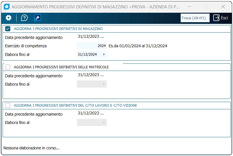 Elaborazione fino al Indicare la data finale del periodo da storicizzare. Tale data aggiorna il campo Data ultimo aggiornamento progressivi di magazzino in Anagrafica ditta.