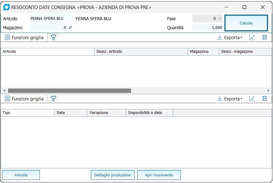 Calcolo Data Consegna viene avviato il programma Resoconto date consegna con la richiesta in testata del magazzino e della quantità: