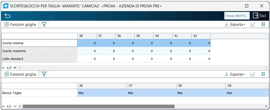 Scorte\blocchi per taglia - variante Creando una scala taglie con un certo numero di taglie, una volta correlata agli articoli è possibile fare in modo che per certi articoli siano visibili solo alcune taglie (o varianti) senza la necessità di creare tante scale taglie quante sono le possibili casistiche.