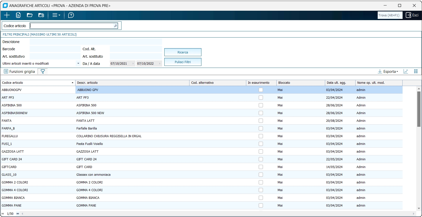 Il programma una volta aperto, mostrerà nella griglia sottostante gli ultimi articoli modificati, oltre ad una serie di filtri.