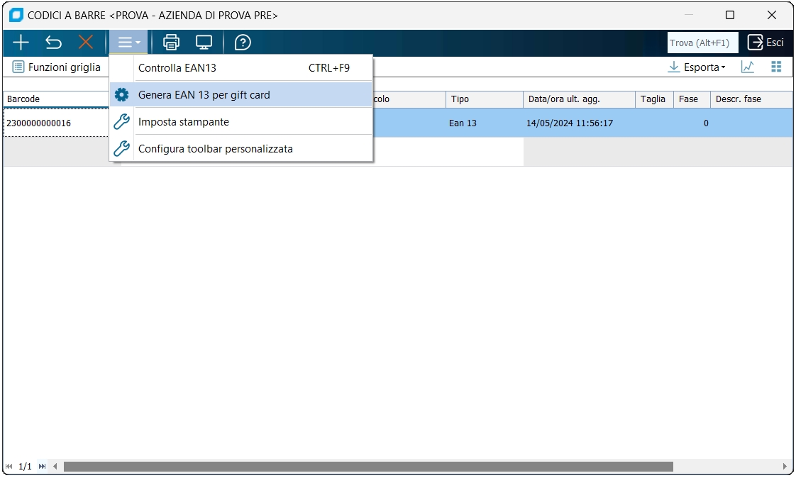 Per gli articoli "Gift Card", nella maschera dei Codici a barre è attiva la funzionalità "Strumenti - Genera EAN 13 per gift card" per la generazione automatica del codice a barre; tale funzionalità è attiva solo se impostata l'opzione di registro Bsmgarti\Opzioni\PrefixEAN13GiftCard. É obbligatorio associare uno o più barcode all'articolo Gift Card, poichè dal GPV è possibile richiamarli solo tramite barcode.