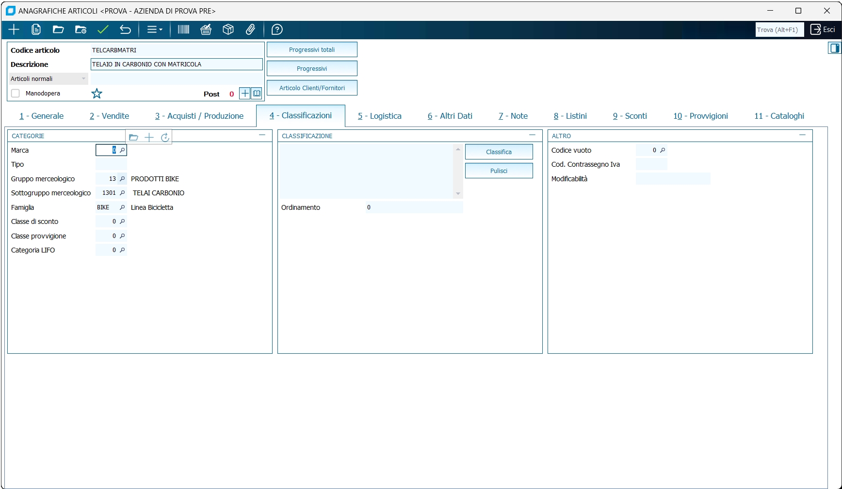 Questo programma permette di codificare le anagrafiche dei vari articoli di magazzino, cioè i vari prodotti commercializzati dall'azienda, le eventuali materie prime e materiali di consumo utilizzati nella loro eventuale produzione.