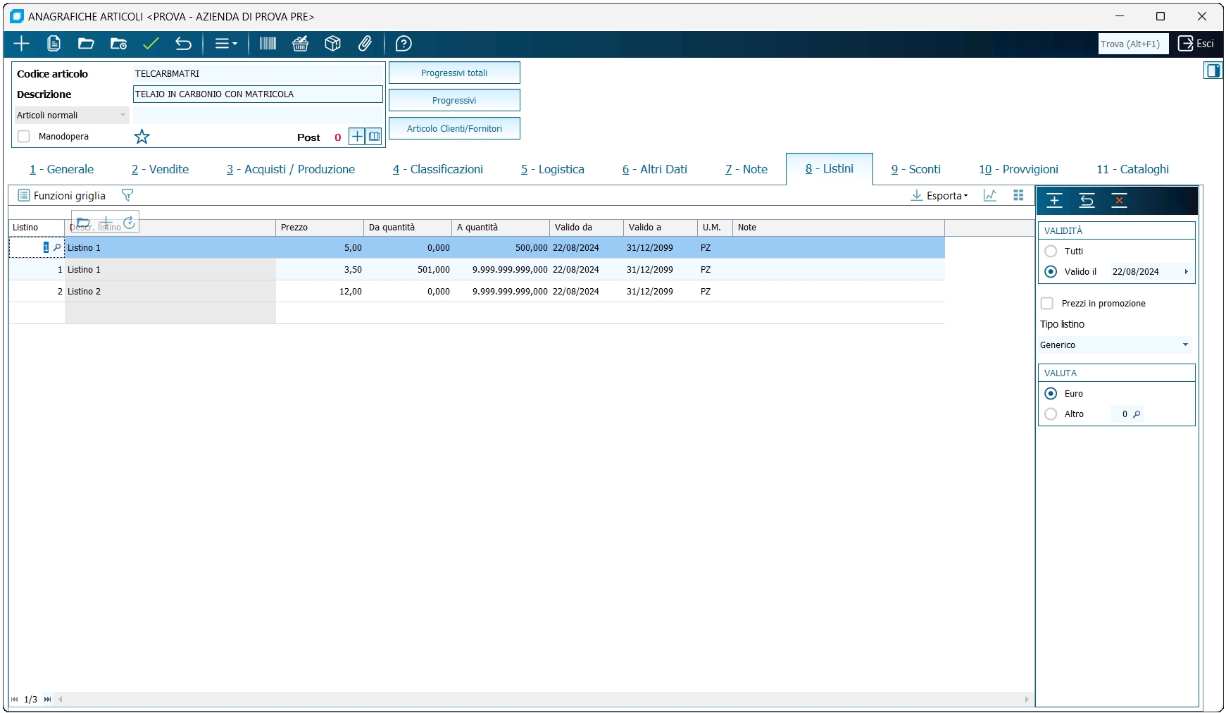 Per quanto concerne la copia dei listini in fase di duplicazione articolo, si consideri che sul nuovo articolo sono copiati solo i listini per cui è indicata l'unità di misura. Durante la copia sono mantenuti prezzi e date di validità originali, mentre l'unità di misura, se cambiata, è aggiornata con quella dell'articolo appena creato. Se sull'articolo di partenza esiste un listino per l'unità di misura Secondaria e/o Confezione, ma nella finestra di Duplicazione queste unità di misura non sono valorizzate, tali listini non saranno copiati sul nuovo articolo. L'operatore che effettua la duplicazione deve eseguire la correzione / aggiornamento dei prezzi nei listini, se le unità di misura indicate per il nuovo articolo differiscono da quelle dell'articolo sorgente.