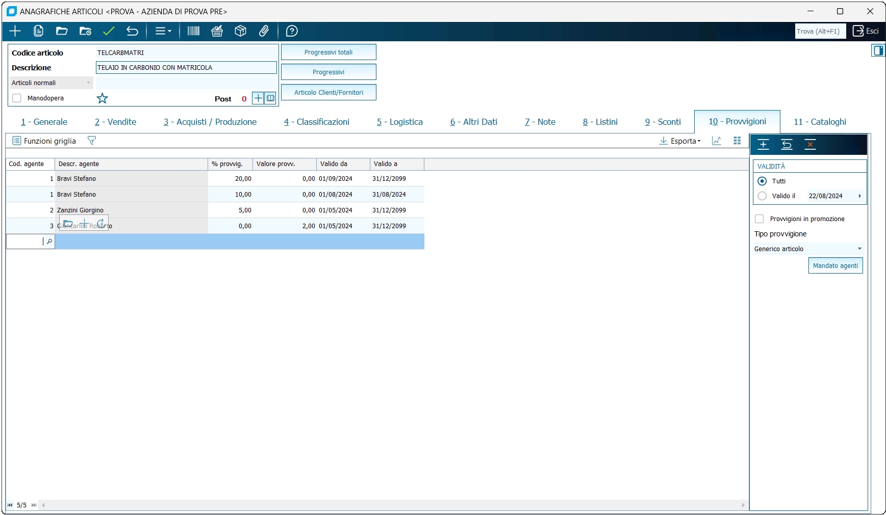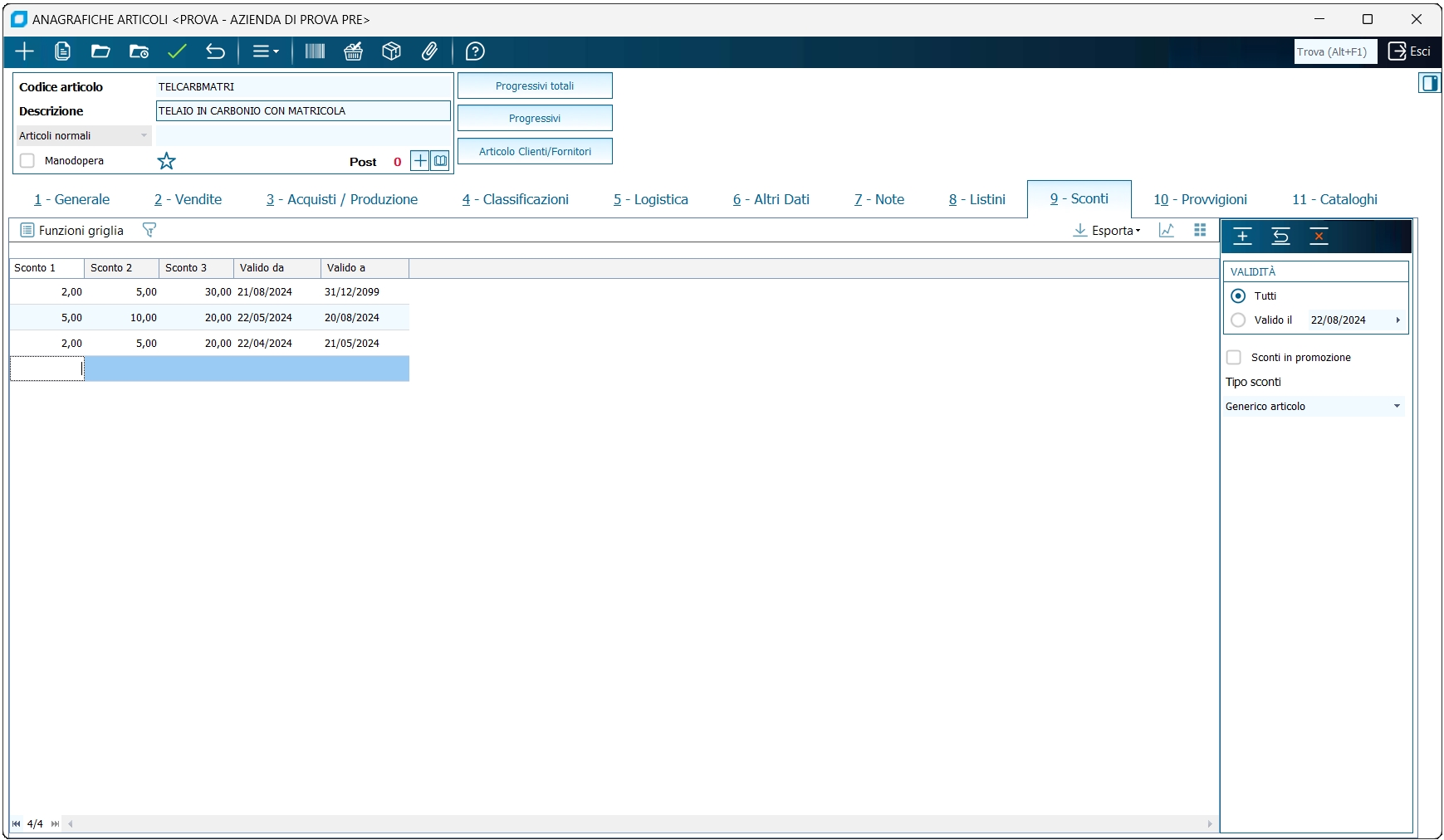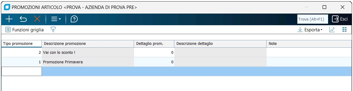 Promozioni Richiama una finestra in cui è possibile vedere o inserire le promozioni di cui l'articolo ha fatto o fa parte.