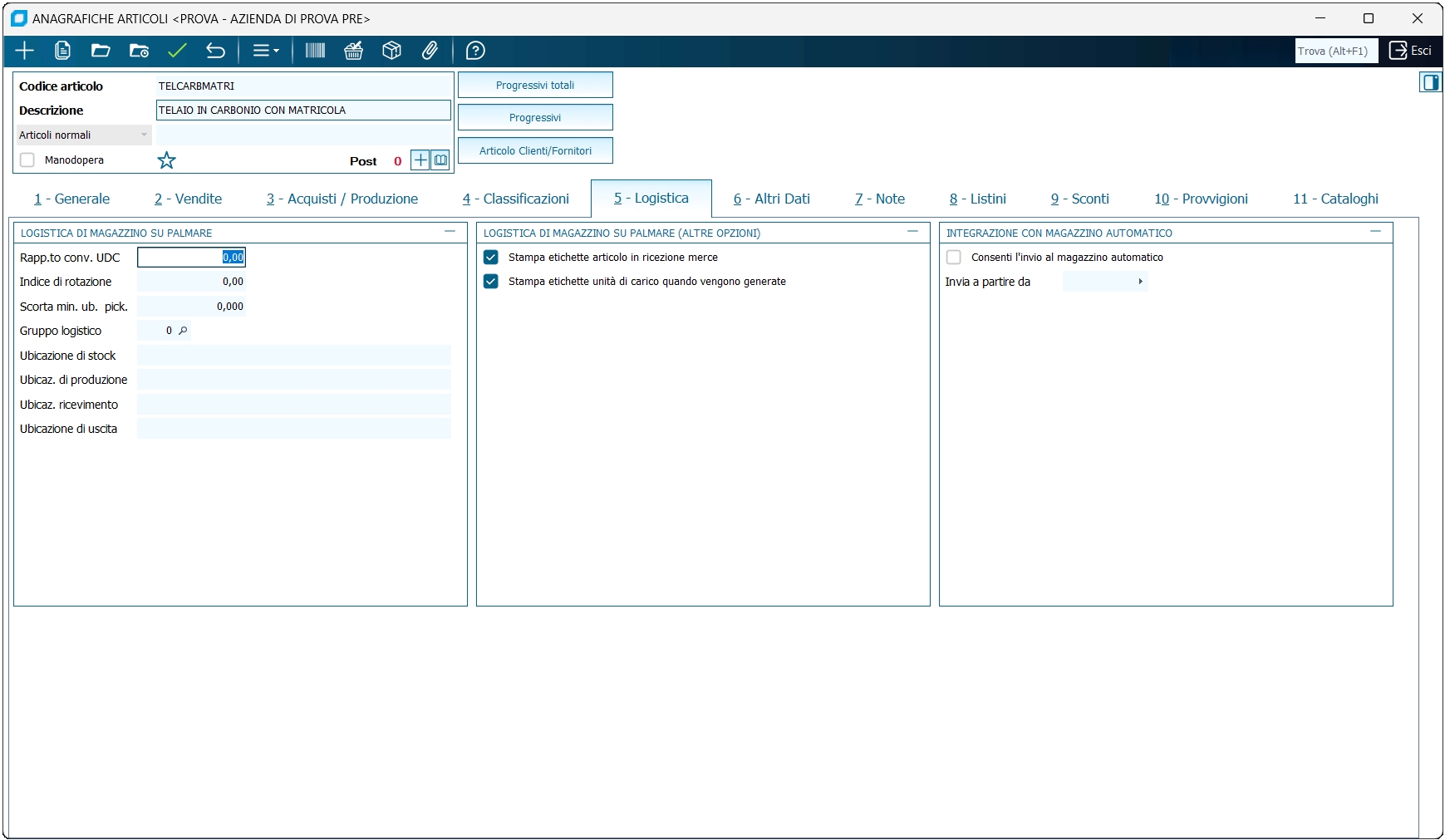 Articoli/Magazzino (SHIFT+F12) Imposta politiche di gestione dell'articolo a magazzino specifiche per ogni magazzino, in deroga a quelle standard impostate in Acquisti e produzione (solo per MRP Low Level Code) e quelle impostate in Magazzini/U.M. relative alla logistica di magazzino su palmare.