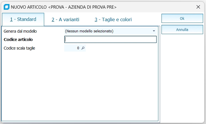 Genera dal modello In fase di creazione di un nuovo articolo è possibile anche avvalersi della funzionalità "Genera dal modello", abilitata a condizione che si sia preventivamente creato almeno un articolo dotato di codice che inizia col prefisso "MODELLO_".