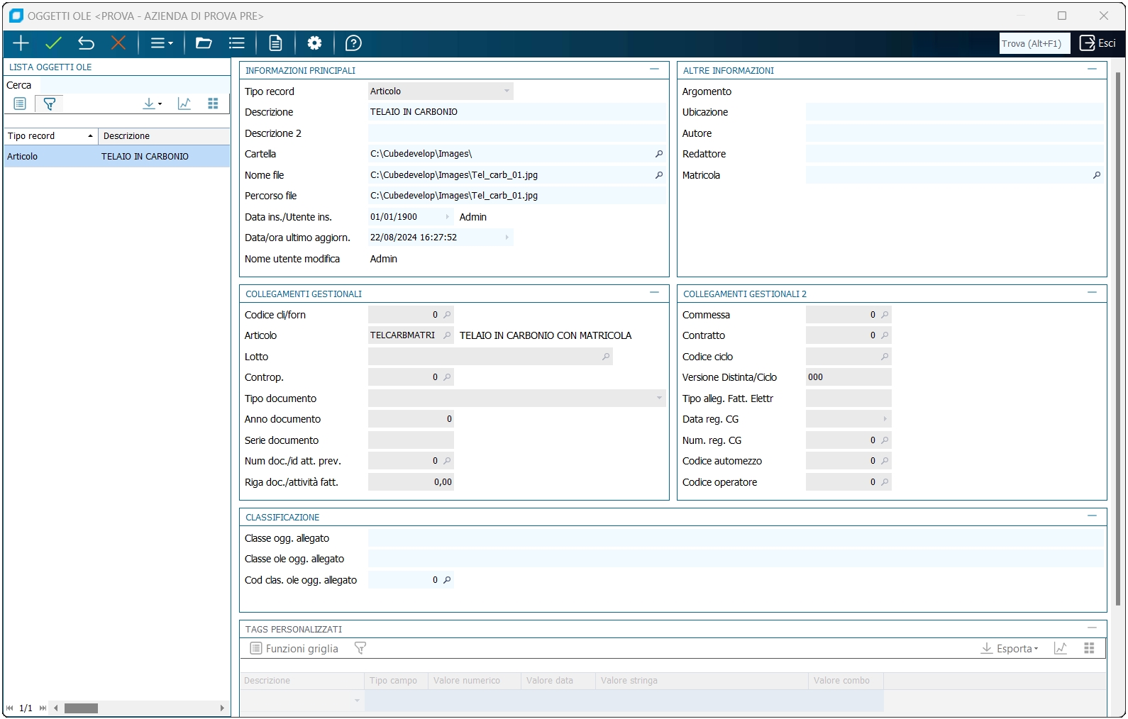 OLE Apre la finestra di dialogo chiamata OGGETTI OLE, mediante cui è possibile associare un qualsiasi tipo di oggetto OLE tra quelli disponibili nel sistema (immagini, documenti, fogli di excel, file, ecc.) ad ogni articolo dell'azienda su cui si sta operando.