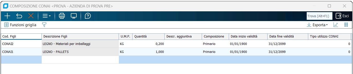 Conai Attivo solo se l'articolo ha Applicazione CONAI = Prima cessione. Apre una finestra in cui è possibile inserire il codice degli articoli che identificano i materiali soggetti a Conai con le relative quantità. Questi articoli devono avere il codice articolo che inizia per CONAI e l'unità di misura = Kg. Il campo 'composizione' è ereditato e modificabile nei documenti di magazzino nel 'dettaglio conai' e permette di effettuare dei raggruppamenti in fase di stampa del programma 'Stampa dati conai'.