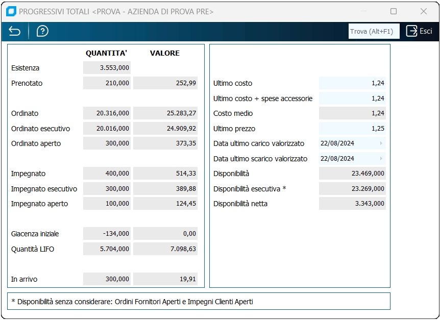 Progressivi totali Apre una finestra di dialogo che visualizza i totali dell'articolo in oggetto per quantità e per valore, la disponibilità, le date relative all'ultimo acquisto/vendita e i prezzi applicati. Tra i dati esposti è evidenziato anche il costo medio d'acquisto, calcolato al momento in base ai dati contenuti negli archivi.