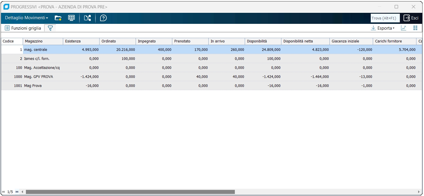 Progressivi Apre una griglia che visualizza, divise per magazzino, le quantità impegnate, ordinate, le giacenze ecc. Nellla finestra sono presenti le funzioni: