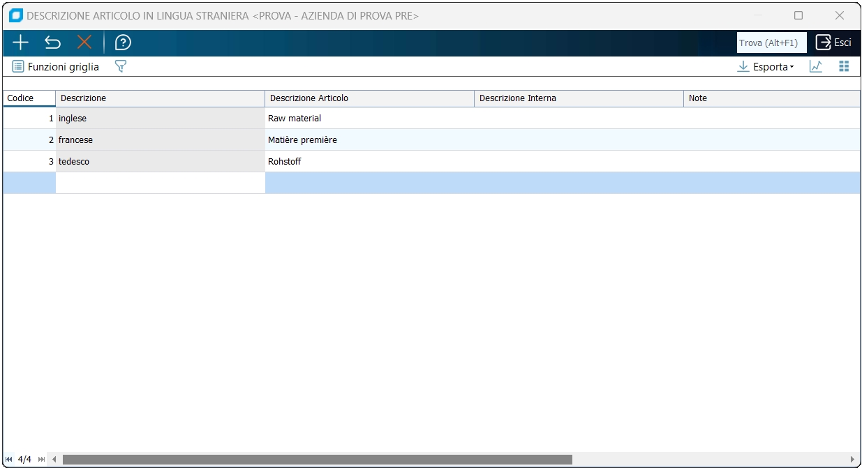 Descrizione in lingua Abilita una griglia per l'inserimento delle descrizioni in altre lingue.