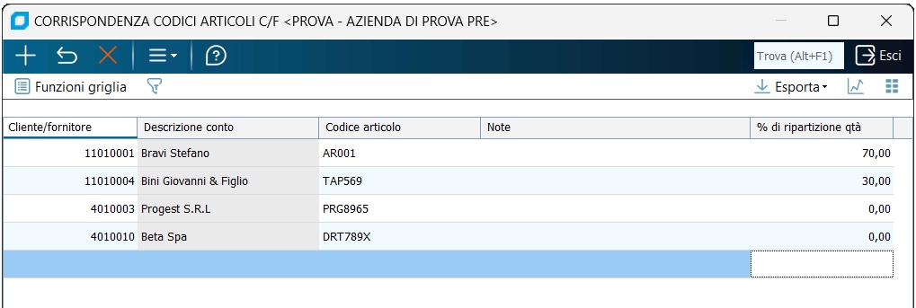 Tale griglia permette d'inserire nella colonna % di ripartizione qtà la percentuale di ripartizione delle quantità di materiale da ordinare ai fornitori; questa colonna è riferita alla spunta Ripartisci su più fornitori presente nella scheda Acquisti e Produzione.
