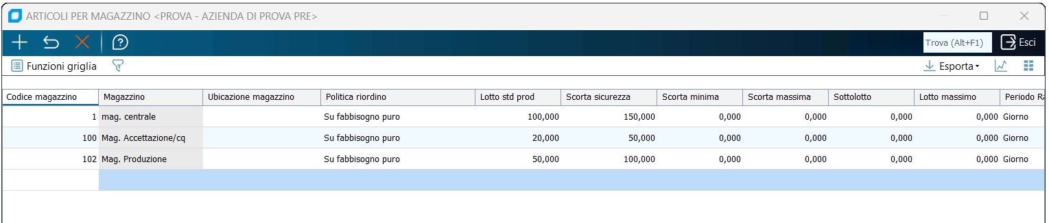 Facciamo l'esempio di un articolo con: Esistenza = 0, Ordinato = 0, Impegnato = 0, Scorta di sicurezza = 2