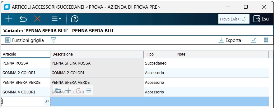 Articoli accessori/succedanei Accede alla gestione dei collegamenti di quell'articolo con articoli che possono essere considerati articoli alternativi (=succedanei), e articoli accessori, cioè utilmente proponibili con quell'articolo.