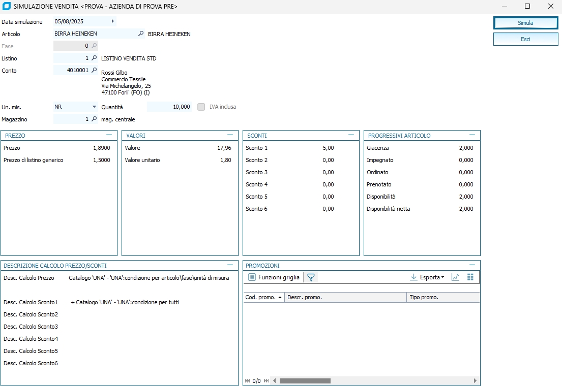 Simulazione vendite É una funzione analoga a quella che simula le scadenze nelle Forme di pagamento; simula un prezzo di vendita di un articolo mentre si tratta col cliente, come se si compilasse una riga di ordine o documento; lancia la ricerca di prezzo e sconti e vede le giacenze di magazzino.