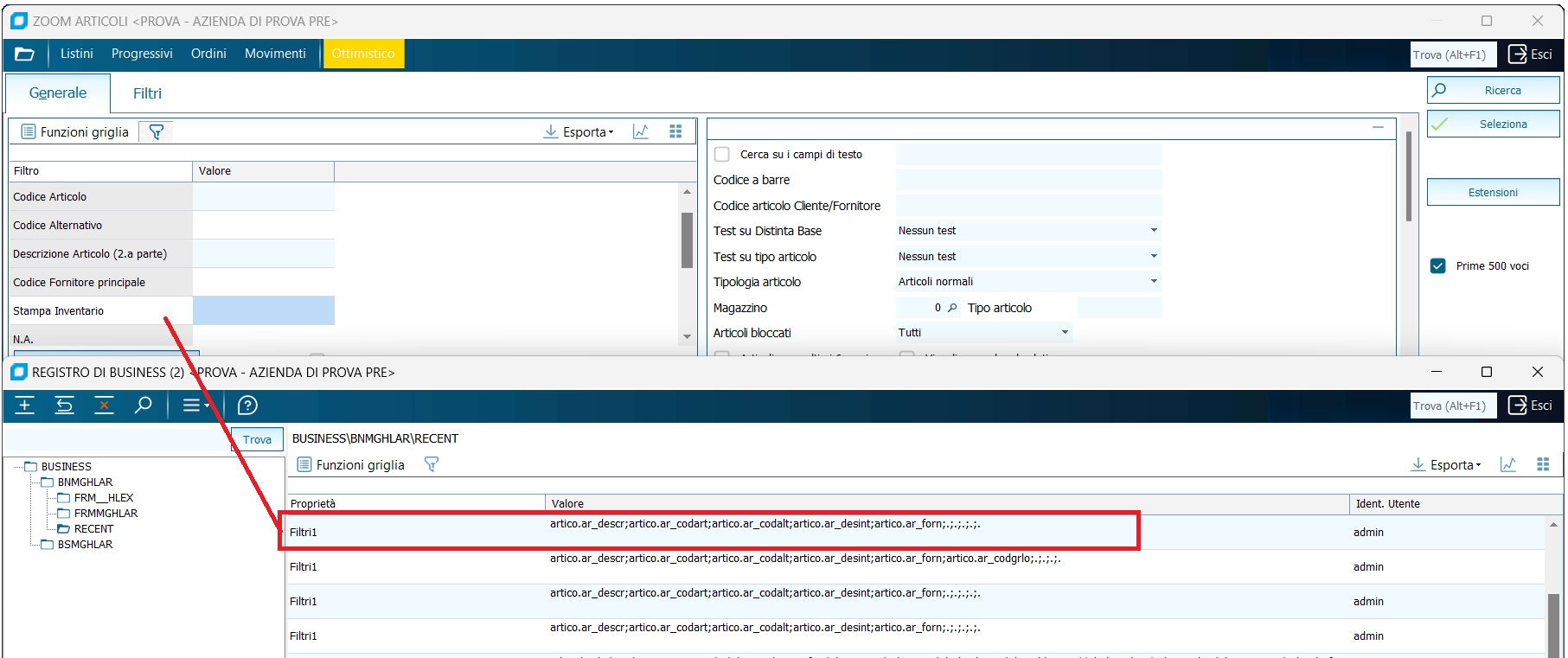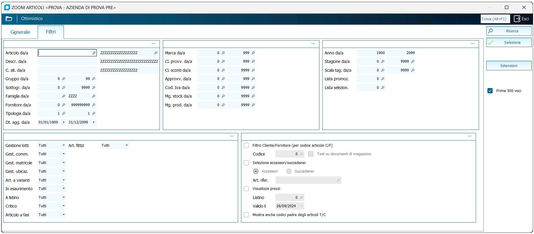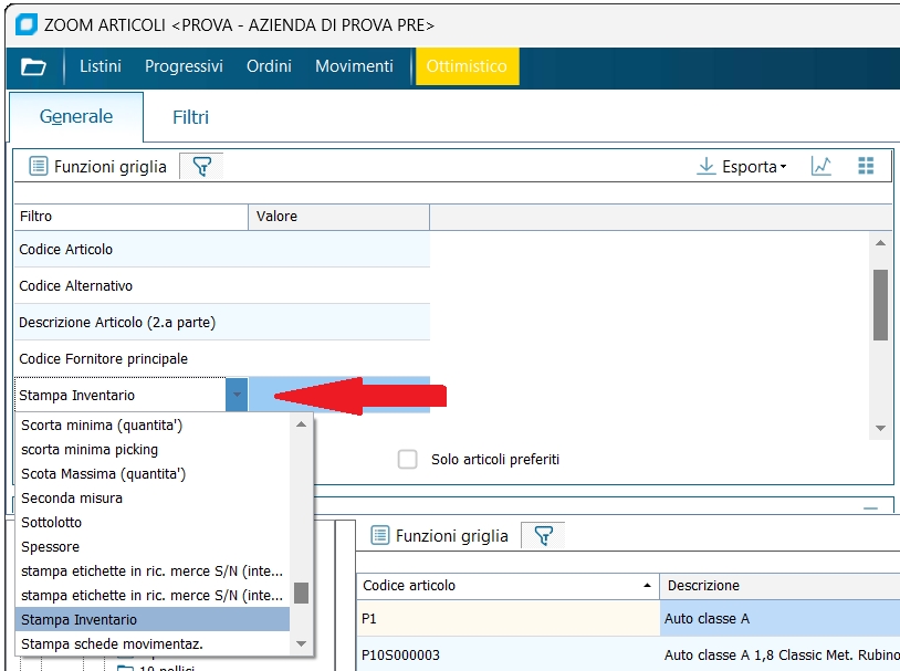 Lo zoom articoli appare in modo diverso e ha funzionalità diverse a seconda di come e dove viene richiamato: 1) se si richiama lo zoom da un qualsiasi campo dove occorre specificare un codice articolo, lo zoom articoli viene avviato nella forma più classica, ovvero permettendo di selezionare un solo record, la maschera offre un ampio set di filtri all'utente, tra cui anche una parte personalizzabili a seconda delle esigenze 2) se richiamato invece dal comando di "Seleziona articoli" presente in maschere come la stampa inventario o la gestione del'inventario fisico, sarà possibile selezionare tutti o un gruppo di articoli a seconda dei filtri impostati, dei quali si potranno visualizzare le relative schede anagrafiche spostandosi con i tasti "frecce" da una scheda all'altra, inoltre alla conferma della schermata i filtri impostati vengono salvati in un recent per operatore, per cui la volta successiva sarà possibile ricaricare i filtri utilizzando il comando "Ultime impostazioni". NB: non vengono salvati i filtri impostati nelle "Estensioni Anagrafiche".