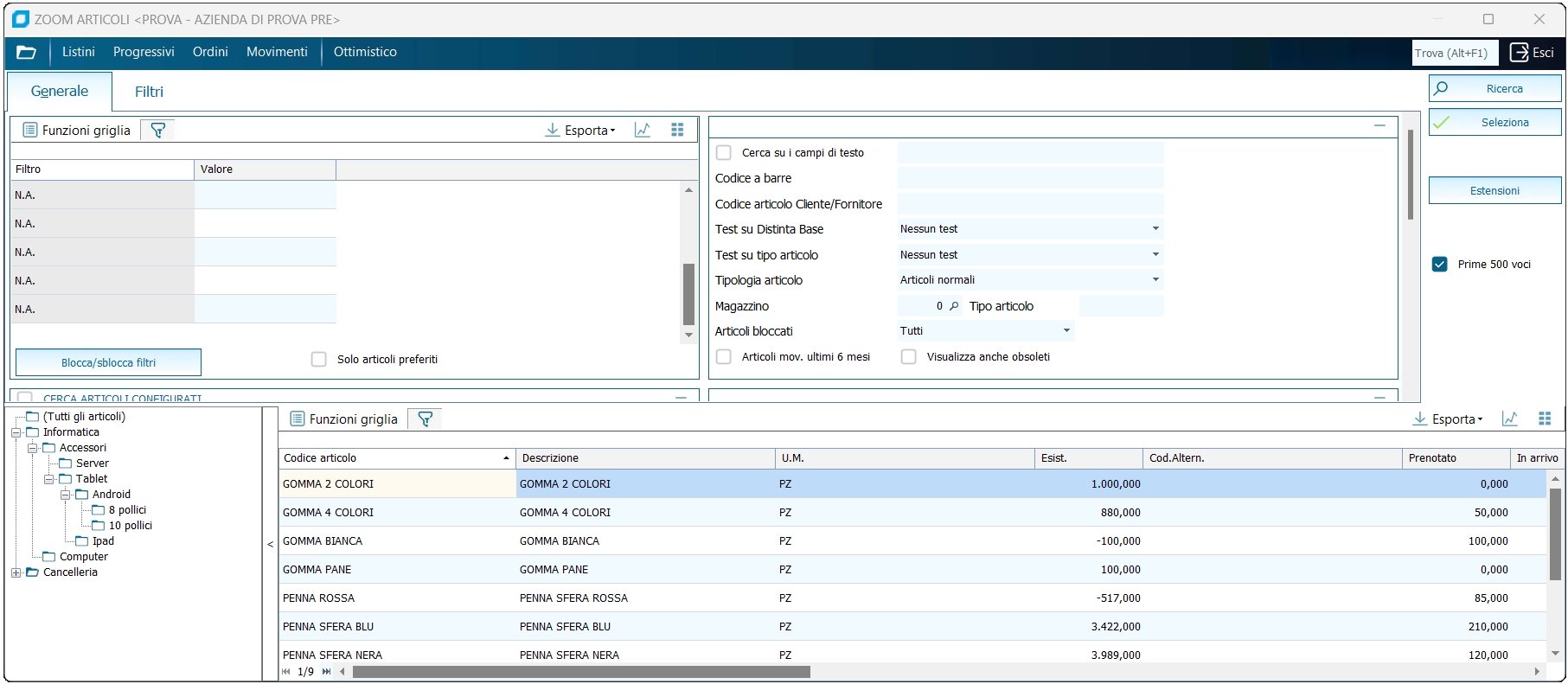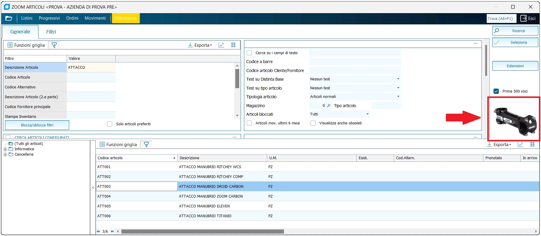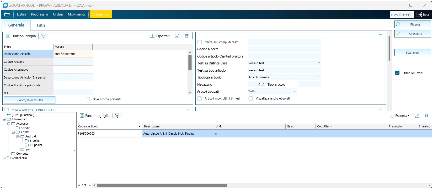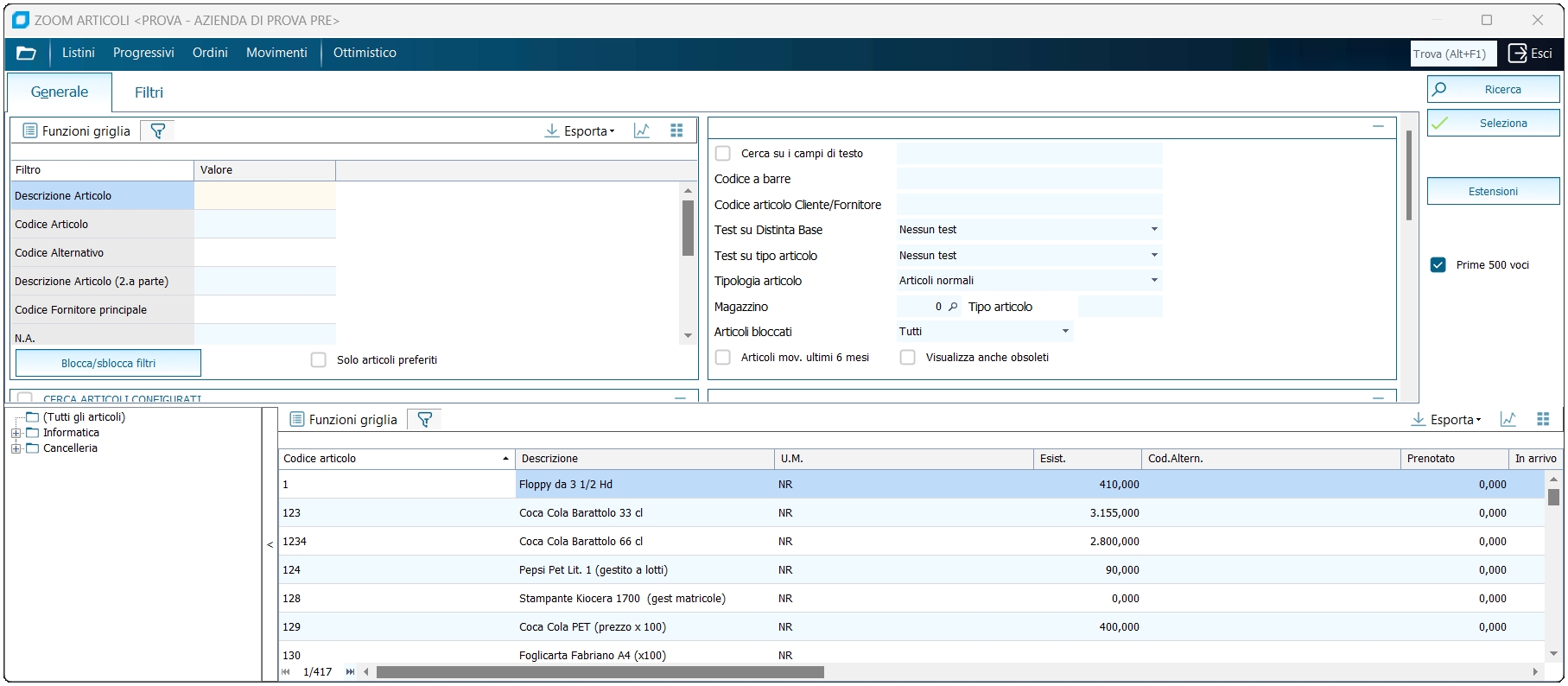 Nello zoom articoli è presente anche il treeview con rappresentazione grafica della classificazione articoli. Selezionando un livello verrà avviata la ricerca degli articoli corrispondenti alla categoria o ad un suo figlio, filtrando anche per gli altri eventuali filtri indicati nello zoom.