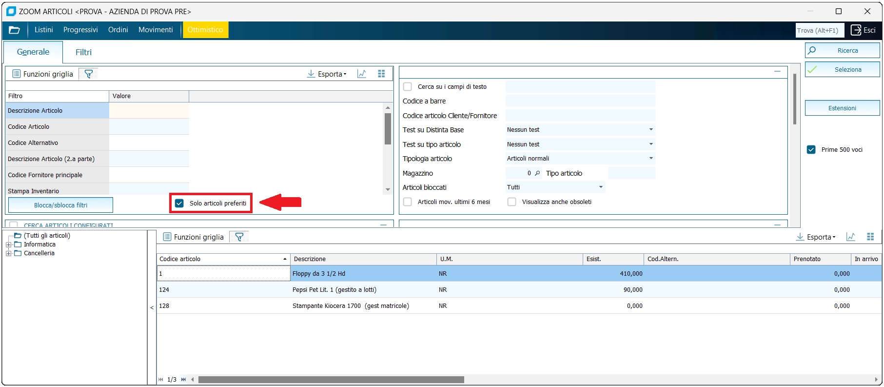 Solo articoli preferiti: è stata aggiunta la spunta "considera solo preferiti" che mostrerà quindi solo gli articoli che soddisfano le condizioni di ricerca impostate e che siano dei preferiti dell'utente di lavoro. La spunta è una condizione aggiuntiva per cui, di tutti i record che rientrano nella ricerca, vengono rilevati solamente quelli che sono dei preferiti.