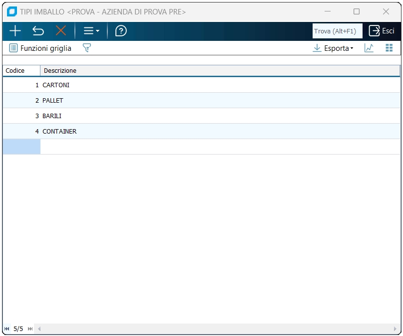Moduli richiesti: Modulo Base Su questo programma si inseriscono, modificano, eliminano i codici relativi ai vari tipi di imballo utilizzati dall'azienda. La tabella, ad oggi, ha solo valore descrittivo.