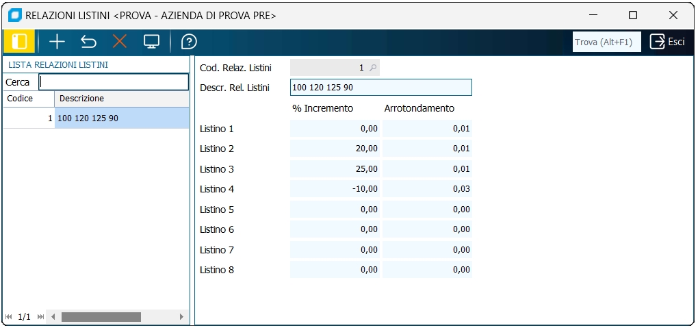 Questo programma gestisce la tabella che contiene le possibili relazioni tra listino 1 e gli altri listini. Ad esempio, per un'azienda che adotta 4 listini di vendita, una relazione tra listini potrebbe essere la seguente: