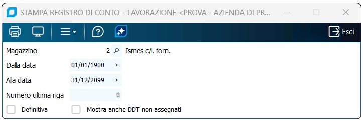 Per un magazzino di merce propria presso terzi (C/lavoro fornitori, o c/lavoro esterno) o di merce altrui (C/lavoro clienti o conto lavoro interno), questo programma stampa un registro di carico e scarico cronologico che riporta i movimenti effettuati con documenti di tipo DDT EMESSI, DDT RICEVUTI e CARICHI/SCARICHI DI PRODUZIONE e con causali con tipo movimento C (=carico conto lavoro) e S (=scarico C/Lavoro). Vedi anche Causali di Magazzino in Guida analitica e Argomenti e moduli. Nella stampa prodotto in ordine cronologico sono riportati i movimenti assegnando a ciascuno di essi un numero progressivo e, per i soli movimenti di scarico, i riferimenti al documento di carico, cioè tipo, anno, serie, numero documento e numero riga. Qualora la riga di scarico sia uno scarico a produzione, relativo ad un documento di carico da produzione, la stampa riporta anche l'articolo Prodotto finito/Semilavorato in cui il materiale è stato utilizzato, ed il quantitativo di prodotto o semilavorato ottenuto. Richiedendo l'elaborazione in definitiva sono aggiornati i campi "Progr" e "Data Reg" della tabella dei Magazzini, riportando il numero attribuito all'ultimo movimento stampato e la data finale di stampa. Per effettuare la stampa, settare la stampante con orientamento Orizzontale (Landscape). Per il conto lavoro attivo, questa stampa si basa solo sui carichi di MP e sugli scarichi relativi per produzione, non sui resi al committente, quindi non è utilizzabile con la nuova gestione del "conto lavoro attivo manuale" che non si basa sui carichi di produzione con riferimenti.