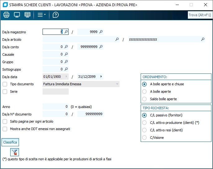 Salto pagina per ogni articolo Spuntare per visualizzare un articolo/magazzino per ogni pagina; in caso contrario la stampa è effettuata nel modo più compatto possibile, anche con più articoli/magazzini nella stessa pagina. Tipo Richiesta Indicare se si vuole un prospetto di conto lavoro passivo, o di conto lavoro attivo se si vuole una rappresentazione basata sugli scarichi a produzione (C/lavoro attivo produzione) oppure basata sui resi a cliente (c/lavoro attivo resi). |