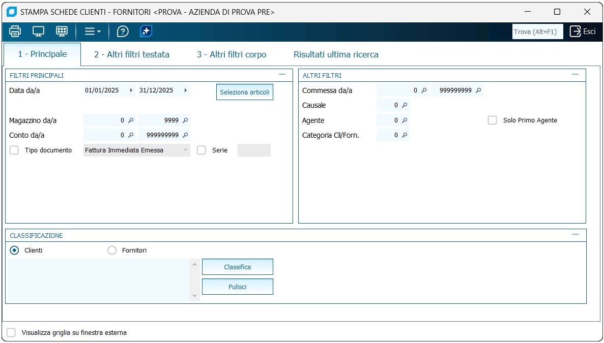 Categoria clienti/fornitori Impostare una categoria per filtrare i dati in base a questo parametro, lasciando 0 sono considerate tutte le categorie clienti/fornitori.