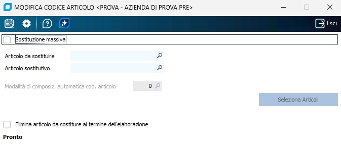 Il programma sostituisce la movimentazione avvenuta su un determinato codice articolo con un altro articolo da indicare in maschera.