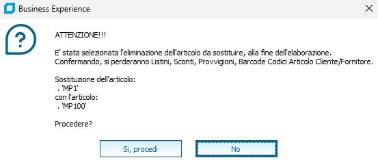 Elimina articolo da sostituire al termine della cancellazione Cancella il codice articolo di origine al termine dell'elaborazione. In tal caso, il programma avvisa che si perderanno anche i relativi listini, sconti, provvigioni, barcode, codarfo dell'articolo cancellato.