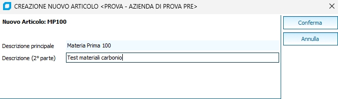Se il nuovo articolo (sostitutivo) non è presente in Anagrafica articoli, in maschera è richiesto il nuovo codice articolo da inserire e le nuove 2 descrizioni. Tutti gli altri dati saranno ereditati dall'articolo di origine.