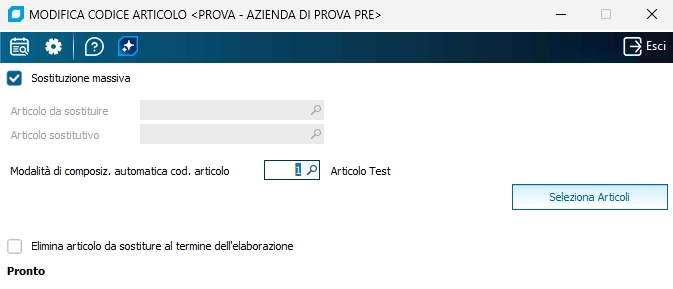 Sostituzione massiva, Questo flag permette di effettuare una sostituzione massiva dei codici articolo, permettendo di selezionare gli articoli da coinvolgere nell'elaborazione, e permettendo quindi di indicare la "modalità di composizione autoamtica cod. articolo", che viene gestita nel programma Modalità creazione codice articolo.