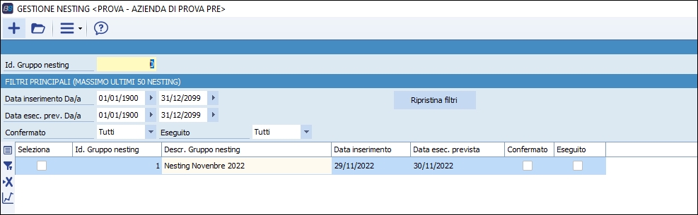 Filtri Principali (Massimo massimo ultimi 50 nesting) sono disponibili filtri come data inserimento, data esecuzione e "status" (confermato/eseguito) per filtrare gli ultimi gruppi inseriti da visualizzare in griglia.