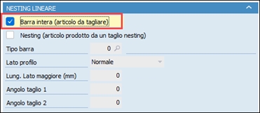 1) Barre intere (o profili) sono articoli che normalmente vengono comprati da fornitori, che devono essere tagliati per realizzare il pezzo (PF/SL) e vengono identificati in anagrafica articoli con il flag "Barra intera (articolo da tagliare)" nel TAB Altri dati >Nesting lineare.
