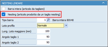 2) Nesting (articolo prodotto da un taglio nesting) sono materiali provenienti dall'esecuzione dei tagli nesting che vengono identificati in anagrafica articoli con il flag "Nesting (articolo prodotto da un taglio nesting)" nel TAB Altri dati >Nesting lineare.