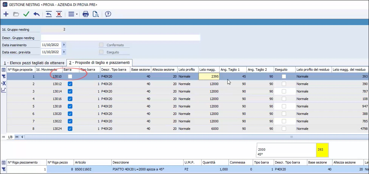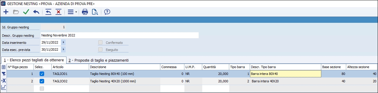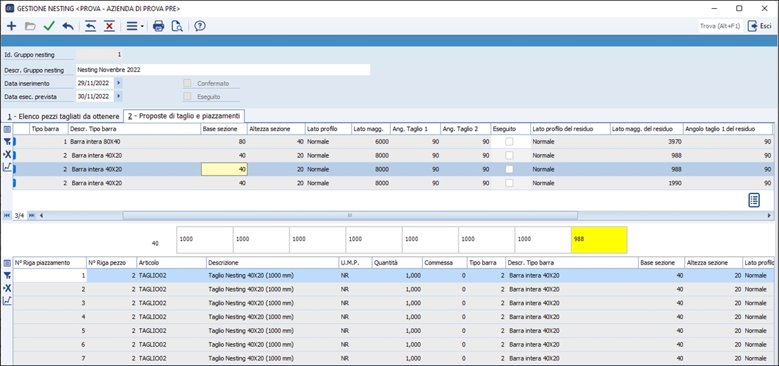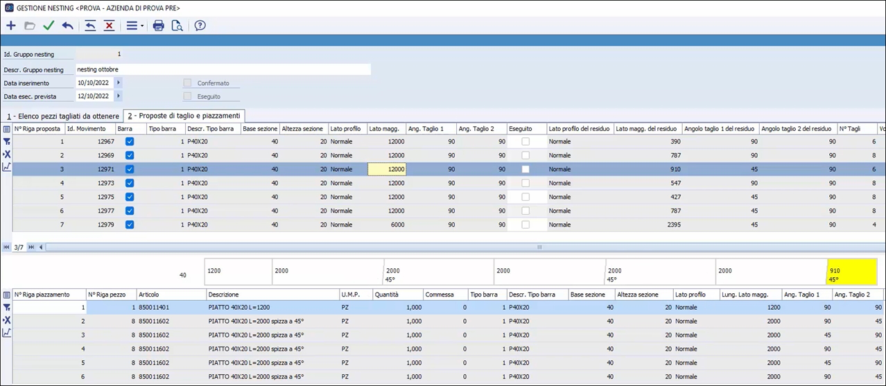 Una volta definito il gruppo gli articoli e le quantità da elaborare, dal menù strumenti, eseguendo la funzione "Calcola proposte di taglio per il nesting" viene eseguito l'algoritmo di calcolo del taglio ottimizzato, dove nella griglia superiore vengono mostrate le barre intere necessarie per ottenere i pezzi e nella griglia in basso i pezzi ottenuti dai tagli di ogni singola barra;