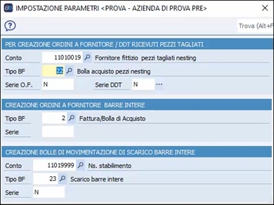 Conto impostare un conto per intestare le bolle di movimentazione interna che vengono generate in fase di esecuzione nesting e che servono per scaricare il materiale (barre intere) a magazzino